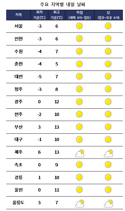 Å©¸®½º¸¶½º À̺êÀÎ ³»ÀÏ(24ÀÏ¡¤È)Àº Àü±¹ ´ëºÎºÐ Áö¿ªÀÌ ´ëü·Î ¸¼Àº °¡¿îµ¥ ¹Ì¼¼¸ÕÁö ³óµµ°¡ ³ô°Ô ³ªÅ¸³ª°Ú´Ù. ¹Î°£±â»ó±â¾÷ ÄÉÀÌ¿þ´õ´Â ¡°³»ÀÏ ¿ì¸®³ª¶ó´Â µ¿ÇغϺÎÇØ»ó¿¡ À§Ä¡ÇÑ °í±â¾ÐÀÇ ¿µÇâÀ» ¹Þ°Ú´Ù¡±¸ç ¡°Àü±¹ÀÌ ´ëü·Î ¸¼°ÚÀ¸³ª Á¦ÁÖµµ´Â ±¸¸§ÀÌ ¸¹¾ÆÁö°Ú°í, ¿ï¸ªµµ´Â µ¿ÇØ»ó¿¡ À§Ä¡ÇÑ ±â¾Ð°ñÀÇ ¿µÇâÀ¸·Î ¿ÀÈıîÁö ºñ ¶Ç´Â ´«ÀÌ ¿À°Ú´Ù. ¡±°í ¿¹º¸Çß´Ù. ¾ÆÄ§ ÃÖÀú±â¿ÂÀº –5¡É¿¡¼ 6¡É, ³· ÃÖ°í±â¿ÂÀº 5¡É¿¡¼ 13¡ÉÀÇ ºÐÆ÷¸¦ º¸ÀÌ¸ç Æò³âº¸´Ù 2~5¡É ³ô°Ú´Ù.
