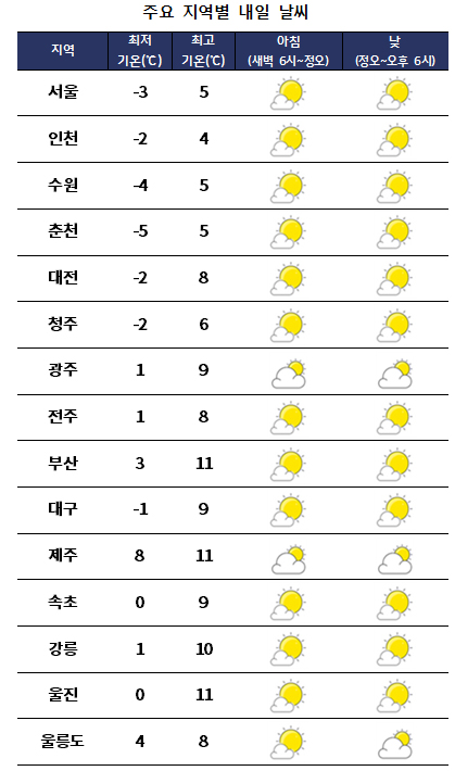 ¾ÆÄ§ ÃÖÀú±â¿ÂÀº -5¡É¿¡¼ 8¡É, ³· ÃÖ°í±â¿ÂÀº 4¡É¿¡¼ 11¡É·Î Æò³âº¸´Ù 2~3¡É ³ô°Ú´Ù.