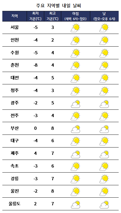 ÁߺϺΠÁö¿ª¿¡ ÇÑÆÄ Æ¯º¸°¡ »çÈê° À̾îÁø °¡¿îµ¥ ³»ÀÏ(16ÀÏ)µµ Ãß¿î ³¯¾¾°¡ À̾îÁú °ÍÀ¸·Î º¸ÀδÙ. ÃßÀ§´Â ¸ð·¹(17ÀÏ) ¾ÆÄ§±îÁö À̾îÁø µÚ Á¡Â÷ ´©±×·¯Áú Àü¸ÁÀÌ´Ù. ¹Î°£±â»ó±â¾÷ ÄÉÀÌ¿þ´õ´Â ¡°³»ÀÏ(16ÀÏ) ¿ì¸®³ª¶ó´Â Áß±¹ ºÏºÎÁö¹æ¿¡ À§Ä¡ÇÑ °í±â¾ÐÀÇ °¡ÀåÀÚ¸®¿¡ µé°Ú´Ù¡±¸ç ¡°Àü±¹ÀÌ ´ëü·Î ¸¼Àº °¡¿îµ¥ Àü³²°ú °æ³², Á¦ÁÖ´Â ±¸¸§ÀÌ ¸¹°Ú´Ù¡±°í ¿¹º¸Çß´Ù. ¾ÆÄ§ ÃÖÀú ±â¿ÂÀº –8¡É¿¡¼ 4¡É·Î ´ëºÎºÐ Áö¿ªÀÌ ¿µÇϱǿ¡ ¸Ó¹°¸ç Ãä°Ú°í, ³· ÃÖ°í±â¿ÂÀº 2¡É¿¡¼ 8¡É·Î ¿À´Ã(16ÀÏ)°ú ºñ½ÁÇϰڴÙ.