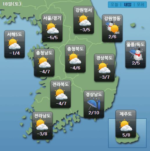 °æ±âºÏºÎ¿Í °¿ø³»·ú¿¡ 4ÀÏ µ¿¾È ÇÑÆÄÆ¯º¸°¡ À̾îÁö´Â µî À̹ø ÁÖ´Â ÃßÀ§°¡ ±â½ÂÀ» ºÎ·È´Ù. ´Ù°¡¿À´Â ÁÖ¸»Àº Àü±¹ÀÌ ¿¹³â ¼öÁØÀÇ ±â¿ÂÀ» ȸº¹ÇϰÚÀ¸³ª ¹Ì¼¼¸ÕÁö ³óµµ°¡ ³ô°Ô ³ªÅ¸³ª°Ú´Ù. ¹Î°£±â»ó±â¾÷ ÄÉÀÌ¿þ´õ´Â ¡°Åä¿äÀÏ(18ÀÏ) ¿ì¸®³ª¶ó´Â Áß±¹ ºÏºÎÁö¹æ¿¡¼ ³²µ¿ÁøÇÏ´Â °í±â¾ÐÀÇ ¿µÇâÀ» ¹Þ°Ú´Ù¡±¸ç ¡°Àü±¹ÀÌ ´ëü·Î ¸¼Àº ÈÄ Á¡Â÷ ±¸¸§ÀÌ ¸¹¾ÆÁö°Ú°í, °¿ø¿µµ¿°ú °æ»ó µ¿ÇؾÈÀº ´« ¶Ç´Â ºñ°¡ ¿Â ÈÄ °³°Ú´Ù¡±°í ¿¹º¸Çß´Ù. * ¿¹»ó °¼ö·®(~18ÀÏ) - °¿ø¿µµ¿, °æ»ó µ¿ÇؾÈ(18ÀÏ) : 5~20mm * ¿¹»ó Àû¼³·®(~18ÀÏ) - °¿ø»ê°£, °æºÏºÏºÎ»ê°£(18ÀÏ) : 1~5cm - °¿ø µ¿ÇؾÈ, °æºÏºÏºÎµ¿ÇؾÈ(18ÀÏ), ¿ï¸ªµµ, µ¶µµ : 1cm³»¿Ü ÀÏ¿äÀÏ(19ÀÏ)Àº Áß±¹ »óÇØ ºÎ±Ù¿¡ À§Ä¡ÇÑ °í±â¾ÐÀÇ °¡ÀåÀÚ¸®¿¡ µé°ÚÀ¸³ª ÁߺÎÁö¹æÀº ºÏÂÊÀ» Áö³ª´Â ±â¾Ð°ñÀÇ ¿µÇâÀ» ¹Þ°Ú´Ù. ÁߺÎÁö¹æ(°¿ø¿µµ¿ Á¦¿Ü)Àº Â÷Â÷ Èå·ÁÁ® ¿ÀÈÄ ÇѶ§ ºñ³ª ´«ÀÌ ¿Â ÈÄ °³°Ú°í °¿ø¿µµ¿°ú ³²ºÎÁö¹æÀº ±¸¸§ÀÌ ¸¹°Ú´Ù. Åä¿äÀÏ(18ÀÏ)±îÁö °¿ø»êÁö¿Í °æºÏµ¿ºÎ¿¡´Â ´Ù¼Ò ¸¹Àº ´«ÀÌ ³»·Á ½×ÀÌ´Â °÷ÀÌ ÀÖ°Ú°í, °¿øµ¿ÇؾȰú °æ³²µ¿Çؾȿ¡µµ ´«ÀÌ ³»·Á ½×ÀÌ´Â °÷ÀÌ ÀÖ°Ú´Ù. ºñ³ª ´«ÀÌ ³»¸®´Â Áö¿ª¿¡¼´Â ³»¸° ´«ÀÌ ½×À̰ųª ¾ó¸é¼ µµ·Î°¡ ¹Ì²ô·¯¿î °÷ÀÌ ¸¹°ÚÀ¸´Ï °¢Á¾ ¾ÈÀü»ç°í¿¡ À¯ÀÇÇØ¾ß°Ú´Ù. ÁÖ¸» µ¿¾È ¾ÆÄ§ ÃÖÀú±â¿ÂÀº -8¡É¿¡¼ 3¡É, ³· ÃÖ°í±â¿ÂÀº 3¡É¿¡¼ 10¡É·Î Æò³âº¸´Ù 2~4¡É ³ôÀº ºÐÆ÷¸¦ º¸À̰ڴÙ. ¹Ù´ÙÀÇ ¹°°áÀº ¼Çػ󿡼 0.5~1.5m, ³²Çػ󿡼 0.5~2.5m·Î Àϰڰí, µ¿Çػ󿡼 1~3m·Î ÀÏ°Ú°í µ¿Çس²ºÎ ¸Õ¹Ù´Ù¿¡´Â ¹Ù¶÷ÀÌ °ÇÏ°Ô ºÒ¸ç ¹°°áÀÌ ³ô°Ú´Ù. °ÇÁ¶ Ưº¸°¡ ¹ßÈ¿ ÁßÀÎ °¿ø¿µµ¿°ú °æ»óÇØ¾È, ÀϺΠ°æ»ó³»·ú¿¡¼´Â ´ë±â°¡ ¸Å¿ì °ÇÁ¶Çϰڰí, ±× ¹ÛÀÇ Áö¿ªµµ ´ë±â°¡ Â÷Â÷ °ÇÁ¶ÇØÁö°Ú´Ù. Åä¿äÀÏ(18ÀÏ) ¼¿ï°ú °æ±â, °¿ø¿µ¼, ÃæÃ», ÀüºÏ, °æºÏÀº Ãʹ̼¼¸ÕÁö ³óµµ°¡ ¡®³ª»Ý¡¯ ´Ü°è, ±× ¹ÛÀÇ Àü±¹Àº ¡®º¸Å롯 ¼öÁØÀ» º¸À̰ڴÙ. ´ë±â¿À¿°¹°ÁúÀÌ Á¤Ã¼µÇ¸é¼ ÀÏ¿äÀÏ(19ÀÏ) ¿ÀÈĺÎÅÍ Àü±¹ ´ëºÎºÐ Áö¿ª¿¡¼ Ãʹ̼¼¸ÕÁö ³óµµ°¡ ¡®ÇѶ§ ³ª»Ý¡¯ ¶Ç´Â ¡®³ª»Ý¡¯ ¼öÁرîÁö ¿À¸£°Ú´Ù. ÇÑÆí ±â¾Ð°ñÀÇ ¿µÇâÀ¸·Î 19ÀÏÀº ÁߺÎÁö¹æ(°¿ø¿µµ¿Á¦¿Ü)¿¡ ºñ ¶Ç´Â ´«ÀÌ ³»¸®°Ú°í ´ÙÀ½ ÁÖ´Â 22~23ÀÏ ÃæÃ»À̳²Áö¹æ¿¡ ºñ°¡ ¿À°Ú´Ù.