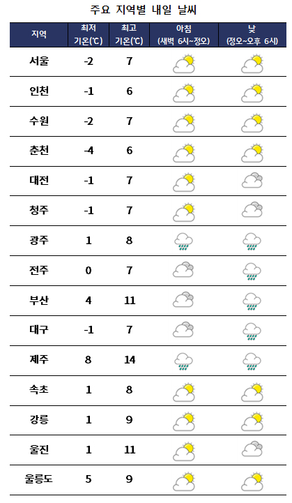 ¼ö¿äÀÏÀÎ ³»ÀÏ(22ÀÏ)Àº Àü±¹ÀÌ ´ëü·Î Æ÷±ÙÇÑ °¡¿îµ¥ ³²ºÎÁö¹æ¿¡ ºñ°¡ ³»¸®°Ú´Ù. ÄÉÀÌ¿þ´õ ¿¹º¸¼¾ÅÍ´Â ¡°³»ÀÏ(22ÀÏ) ¿ì¸®³ª¶ó´Â Á¦ÁÖµµ¼ÂÊÇØ»ó¿¡¼ ´Ù°¡¿À´Â ±â¾Ð°ñÀÇ ¿µÇâÀ» Â÷Â÷ ¹Þ°Ú´Ù¡±¸ç ¡°Àü±¹ÀÌ Á¡Â÷ Èå·ÁÁ® ¾ÆÄ§¿¡ Á¦ÁÖµµ¿¡ ºñ°¡ ½ÃÀÛµÇ¾î ¿ÀÈÄ¿¡´Â ³²ºÎÁö¹æ±îÁö È®´ëµÇ¾î ³»¸®°Ú´Ù¡±°í ¿¹º¸Çß´Ù. *¿¹»ó °¼ö·®(~23ÀÏ) - ³²ÇؾÈ, Á¦ÁÖµµ : 20~50mm (Á¦ÁÖ »ê°£ 80mm ÀÌ»ó) - ³²ºÎ(³²ÇؾÈ, °æºÏºÏºÎ Á¦¿Ü) : 10~30mm - ÃæÃ», °æºÏºÏºÎ(23ÀÏ) : 5~10mm - ¼¿ï°æ±â, °¿ø : 5mm¹Ì¸¸ ¾ÆÄ§ ÃÖÀú±â¿ÂÀº -4¡É¿¡¼ 8¡É, ³· ÃÖ°í±â¿ÂÀº 6¡É¿¡¼ 14¡É°¡ µÇ°Ú´Ù. ³²¼Ç³ÀÌ À¯ÀÔµÇ¸é¼ ³»ÀÏ(22ÀÏ)Àº Æò³âº¸´Ù ¾ÆÄ§ 5~6¡É, ³· µ¿¾È¿¡µµ 3~6¡É ³ô¾Æ ºñ±³Àû Æ÷±ÙÇϰڴÙ.