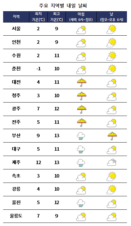 ¾ÆÄ§ ÃÖÀú ±â¿ÂÀº –1¡É¿¡¼ 12¡É, ³· ÃÖ°í±â¿ÂÀº 9¡É¿¡¼ 13¡É·Î Æò³â ´ëºñ 5~9¡É ³ô¾Æ ºñ±³Àû Æ÷±ÙÇϰڴÙ.