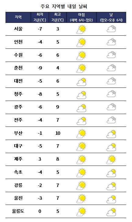 Àý±â»ó ÀÔÃá(í¡õð)ÀÎ 4ÀÏ(È)Àº Âù¹Ù¶÷ÀÌ ºÒ¸ç ÇÑÆÄ°¡ ±â½ÂÀ» ºÎ¸± Àü¸ÁÀÌ´Ù. ±â»óûÀº 3ÀÏ(¿ù) ¿ÀÈÄ 11½Ã °¿ø Æò⡤ö¿ø µî°ú °æºÏ ºÏµ¿ »êÁö¿¡ ÇÑÆÄÁÖÀǺ¸°¡ ¹ßÈ¿µÉ ¿¹Á¤À̶ó°í ¹ßÇ¥Çß´Ù. ºÏ¼ÂÊ¿¡¼ Âù °ø±â°¡ À¯ÀÔµÇ¸é¼ ¼¿ïÀ» ºñ·ÔÇÑ Áߺγ»·ú°ú ³²ºÎ³»·úÀÇ ¾ÆÄ§ ±â¿ÂÀº –7~8¡É±îÁö ¶³¾îÁö´Â °÷ÀÌ ÀÖ°Ú°í, ÇÑÆÄÁÖÀǺ¸°¡ ³»·ÁÁö´Â Áö¿ª¿¡¼´Â –10¡É±îÁö ¶³¾îÁö´Â °÷µµ ÀÖ°Ú´Ù.