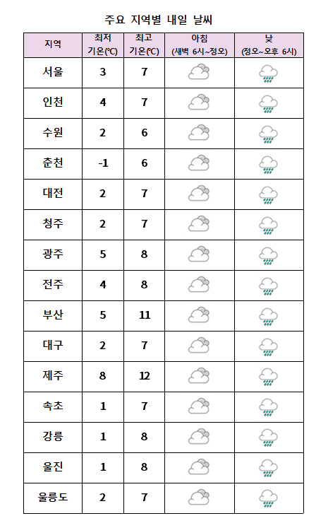 À̾î "°¿ø»ê°£Áö¿ªÀº ´«ÀÌ ³»¸± Àü¸Á"À̶ó¸ç "ÃæÃ»µµ, Àü¶óµµ, °æºÏºÏºÎ, °æ³²³²ºÎ Áö¿ªÀº ¹ã¿¡ ºñ°¡ ±×Ä¡°Ú´Ù"°í ÀüÇß´Ù. ¾ÆÄ§ ÃÖÀú±â¿ÂÀº -1¡É ¿¡¼ 8¡É , ³· ÃÖ°í±â¿ÂÀº 6¡É¿¡¼ 12¡É·Î 1~4¡É ³ô°Ú´Ù.