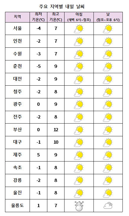 ¸ñ¿äÀÏ(5ÀÏ)Àº ³»ÀÏÀº Àü±¹ÀÌ ´ëü·Î ¸¼Àº °¡¿îµ¥ ¿ï¸ªµµ¿Í µ¶µµ¿¡ ¿ÀÀü ÇѶ§ ´«ÀÌ ¿À°Ú°í, Âù °ø±â°¡ À¯ÀԵбâ¿ÂÀÌ ¶Ò ¶³¾îÁö°Ú´Ù. ¹Î°£±â»ó±â¾÷ ÄÉÀÌ¿þ´õ´Â ¡°³»ÀÏ(5ÀÏ) ¿ì¸®³ª¶ó´Â Áß±¹ »êµÕ¹Ýµµ ºÎ±Ù¿¡¼ µ¿ÁøÇÏ´Â °í±â¾ÐÀÇ °¡ÀåÀÚ¸®¿¡ µé¸ç Àü±¹ÀÌ ´ëü·Î ¸¼°Ú´Ù¡±¸ç ¡°¿ï¸ªµµ¿Í µ¶µµ´Â ÇØ±âÂ÷·Î ÀÎÇØ »ý¼ºµÈ ±¸¸§´ëÀÇ ¿µÇâÀ¸·Î ¿ÀÀü¿¡ ´«ÀÌ ¿À´Ù°¡ ±×Ä¡°Ú´Ù¡±°í ¿¹º¸Çß´Ù. * ¿¹»ó °¼ö·®(5ÀÏ) - ¿ï¸ªµµ, µ¶µµ : 5mm³»¿Ü * ¿¹»ó Àû¼³·®(5ÀÏ) - ¿ï¸ªµµ, µ¶µµ : 1~5cm ¾ÆÄ§ ÃÖÀú±â¿ÂÀº -6¡É¿¡¼ 5¡É, ³· ÃÖ°í±â¿ÂÀº 7¡É¿¡¼ 12¡É·Î Æò³â°ú ºñ½ÁÇϰÚÀ¸³ª ¾ÆÄ§ ±â¿ÂÀÌ ¿À´Ãº¸´Ù 5~7¡É °¡·® ³·°í ¹Ù¶÷ÀÌ ºÒ¸é¼ ü°¨¿Âµµ´Â –11¡É~-2¡É·Î ³·¾Æ Ãä°Ú´Ù.