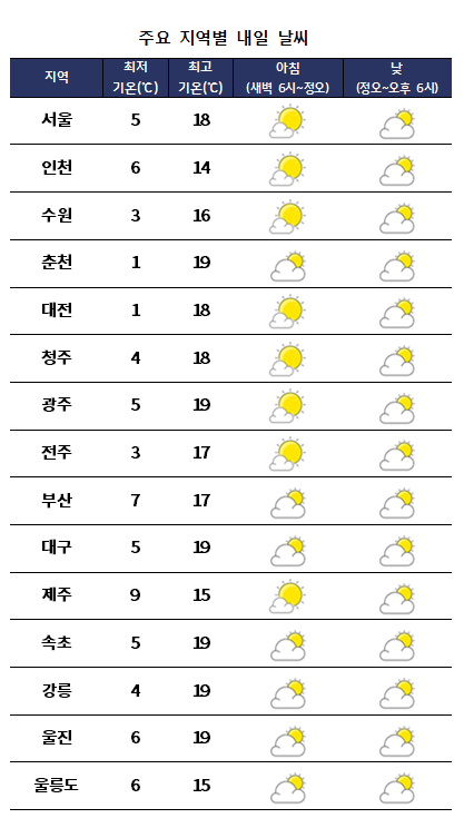 ¸ñ¿äÀÏÀÎ ³»ÀÏ(2ÀÏ)Àº Àü±¹ÀÌ ´ëü·Î ±¸¸§ÀÌ ¸¹°ÚÀ¸³ª µ¿ÂÊ Áö¹æ¿¡´Â »ê¹ßÀûÀ¸·Î ºñ°¡ ¿À´Â °÷ÀÌ ÀÖ°Ú´Ù. ¹Î°£±â»ó±â¾÷ ÄÉÀÌ¿þ´õ´Â ¡°³»ÀÏ(2ÀÏ) ¿ì¸®³ª¶ó´Â Áß±¹ »êµÕ¹Ýµµ ºÎ±Ù¿¡ À§Ä¡ÇÑ °í±â¾ÐÀÇ ¿µÇâÀ» ¹Þ°Ú´Ù¡±¸ç ¡°Àü±¹ÀÌ ´ëü·Î ±¸¸§ÀÌ ¸¹°Ú°í, »õº® ÇѶ§ °æ»óµ¿ÇؾÈÀ» Áß½ÉÀ¸·Î »ê¹ßÀûÀ¸·Î ºø¹æ¿ïÀÌ ¶³¾îÁú ¶§°¡ ÀÖ°Ú´Ù¡±°í ¿¹º¸Çß´Ù. ¾ÆÄ§ ÃÖÀú±â¿ÂÀº 1¡É¿¡¼ 7¡É, ³· ÃÖ°í±â¿ÂÀº 14¡É¿¡¼ 19¡É·Î Àϱ³Â÷°¡ Å©°Ô ¹ú¾îÁö°Ú´Ù. ¸ð·¹(3ÀÏ)±îÁö ´ëºÎºÐ Áö¿ªÀÇ ³· ±â¿ÂÀÌ 15¡É ÀÌ»ó ¿Ã¶ó Æ÷±ÙÇϰÚÀ¸³ª, ºÏ¼ÂÊ¿¡¼ Â÷°í °ÇÁ¶ÇÑ °ø±â°¡ ³»·Á¿À¸é¼ ³»ÀÏ(2ÀÏ) »õº®±îÁö ¹Ù¶÷µµ ´Ù¼Ò °ÇÏ°Ô ºÒ¸ç ½Ò½ÒÇϰڴÙ. °æ±âºÏºÎ ÀϺÎÁö¿ª°ú °¿ø¿µ¼, °æºÏºÏºÎ³»·ú¿¡¼´Â ¾ÆÄ§ ±â¿ÂÀÌ 0¡É ³»¿Ü·Î ¶³¾îÁö´Â °÷ÀÌ ÀÖ°ÚÀ¸´Ï ³óÀÛ¹°ÀÇ ³ÃÇØ ÇÇÇØ ¹× °Ç°°ü¸®¿¡ À¯ÀÇÇØ¾ß°Ú´Ù. ¹Ù´ÙÀÇ ¹°°áÀº ¼Çػ󿡼 0.5~4m, ³²Çػ󿡼 0.5~2.5m, µ¿Çػ󿡼 0.5~3m·Î ÀϰڴÙ. ¼ÇظչٴÙ, Á¦ÁÖ³²Âʸչٴٸ¦ Áß½ÉÀ¸·Î dz¶ûƯº¸°¡ ¹ßÈ¿ ÁßÀÎ °¡¿îµ¥ ¹Ù¶÷ÀÌ ¸Å¿ì °ÇÏ°Ô ºÒ°í, ¹°°áµµ ³ô°Ô ÀϰڴÙ. °ÇÁ¶Æ¯º¸°¡ ¹ßÈ¿ ÁßÀÎ ¼¿ï.°æ±âµµ¿Í °¿ø¿µ¼, ÃæÃ»³»·úÀº ´ë±â°¡ ¸Å¿ì °ÇÁ¶Çϰڰí, ±× ¹ÛÀÇ Áö¿ª¿¡¼µµ ´ë±â°¡ Â÷Â÷ °ÇÁ¶ÇØÁö°Ú´Ù. ¹Ì¼¼¸ÕÁö ³óµµ´Â Àü±¹ÀÇ ´ë±â ¼øÈ¯ÀÌ ¿øÈ°ÇØ ¡®º¸Åë; ´Ü°è¸¦ º¸À̰ڴÙ. ÇÑÆí À̹ø ÁÖ´Â °í±â¾ÐÀÇ ¿µÇâÀ¸·Î Àü±¹ÀÌ ´ëü·Î ¸¼°Ú´Ù.