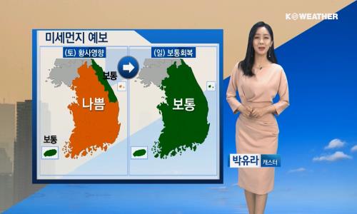 Åä¿äÀÏÀÎ ³»ÀÏ(4ÀÏ¡¤Åä)Àº Ȳ»ç°¡ ¹ß¿øÇÏ¸é¼ °ø±â°¡ ŹÇϰڰí, ´ë±â°¡ °ÇÁ¶ÇÑ °¡¿îµ¥ ¹Ù¶÷ÀÌ °ÇÒ °ÍÀ¸·Î ¿¹»óµÅ ÈÀç»ç°í¿¡ ÁÖÀǰ¡ ÇÊ¿äÇϰڴÙ. ¹Î°£±â»ó±â¾÷ ÄÉÀÌ¿þ´õ¿¡ µû¸£¸é ³»ÀÏ(4ÀÏ¡¤Åä)Àº Áß±¹ ºÏºÎÁö¹æ¿¡¼ ³²ÇÏÇÏ´Â °í±â¾ÐÀÇ °¡ÀåÀÚ¸®¿¡ µé°Ú´Ù. Àü±¹ÀÌ ´ëü·Î ¸¼°ÚÁö¸¸ µ¿ÇؾÈÀº µ¿Ç³ÀÇ ¿µÇâÀ¸·Î ¿ÀÈÄ ÇѶ§ È帮°Ú´Ù. ¾ÆÄ§ ÃÖÀú±â¿ÂÀº 0~9¡É·Î ½Ò½ÒÇÏÁö¸¸ ³· ÃÖ°í±â¿ÂÀº 10~20¡É±îÁö ¿Ã¶ó Æ÷±ÙÇϰڴÙ. Å« Àϱ³Â÷¿¡ °Ç°°ü¸®¸¦ ÀßÇØ¾ß°Ú´Ù. *(ÃÊ)¹Ì¼¼¸ÕÁö ¿¹º¸ - WHO ±âÁØ : ¼¿ï°æ±â, °¿ø¿µ¼, ÃæÃ» ¿ÀÀü '³ª»Ý', ¿ÀÈÄ 'º¸Åë'/ ÀüºÏ, ±¤ÁÖÀü³², ´ë±¸°æºÏ '³ª»Ý'/ °æ³² ¿ÀÀü 'º¸Åë', ¿ÀÈÄ '³ª»Ý'/ °¿ø¿µµ¿, Á¦ÁÖµµ 'º¸Åë' - ȯ°æºÎ ±âÁØ : ¼¿ï°æ±â, °¿ø¿µ¼, ÃæÃ» ¿ÀÀü '³ª»Ý', ¿ÀÈÄ 'º¸Åë'/ ÀüºÏ, ´ë±¸ ¿ÀÀü '³ª»Ý', ¿ÀÈÄ 'ÇѶ§ ³ª»Ý'/ ±¤ÁÖ ¿ÀÀü '³ª»Ý', ¿ÀÈÄ 'ÇѶ§ ³ª»Ý'/ °æºÏ ¿ÀÀü 'º¸Åë', ¿ÀÈÄ 'ÇѶ§ ³ª»Ý'/ °¿ø¿µµ¿, °æ³², Àü³², Á¦ÁÖ 'º¸Åë' ÇÑÆí, Àü±¹ ´ëºÎºÐ Áö¿ªÀ¸·Î °ÇÁ¶Æ¯º¸°¡ ³»·ÁÁø °¡¿îµ¥ ³»ÀÏ(4ÀÏ¡¤Åä) ¹Ù¶÷ÀÌ ´Ù¼Ò °ÇÏ°Ô ºÒ °ÍÀ¸·Î º¸ÀδÙ. ÀÌ¿¡ µû¶ó µ¿ÇؾÈÀ» Áß½ÉÀ¸·Î´Â °Ç³¿¹ºñƯº¸°¡ ³»·ÁÁø »óÅ´Ù. ºÒ¾¾°ü¸®¸¦ öÀúÈ÷ ÇØ¾ß°Ú´Ù. ¹Ù´ÙÀÇ ¹°°áÀº ³²Çص¿ºÎÇØ»óÀ» Á¦¿ÜÇÑ ´ëºÎºÐ ÇØ»óÀ¸·Î dz¶û¿¹ºñƯº¸°¡ ³»·ÁÁø °¡¿îµ¥ ¹°°áÀÌ ÃÖ°í 4m±îÁö ¸Å¿ì ³ô°Ô ÀϰڴÙ. ÀÏ¿äÀÏ(5ÀÏ)Àº ¼¿ïÀÇ ¾ÆÄ§±â¿ÂÀÌ 1¡É±îÁö ¶Ò ¶³¾îÁö´Â µî ¹Ý¦ ÃßÀ§°¡ ã¾Æ¿Ã °ÍÀ¸·Î ¿¹»óµÈ´Ù.