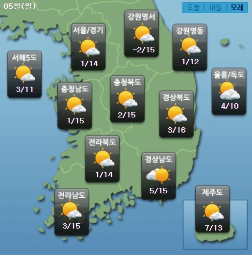 ´Ù°¡¿À´Â ÁÖ¸»Àº Àü±¹ÀÌ ´ëü·Î ¸¼Àº °¡¿îµ¥ Âù °ø±â°¡ À¯ÀÔµÇ¸é¼ ±â¿ÂÀÌ ³·¾ÆÁö°Ú´Ù. ¹Î°£±â»ó±â¾÷ ÄÉÀÌ¿þ´õ´Â ¡°Åä¿äÀÏ(4ÀÏ) ¿ì¸®³ª¶ó´Â Áß±¹ ºÏºÎÁö¹æ¿¡¼ ³²ÇÏÇÏ´Â °í±â¾ÐÀÇ °¡ÀåÀÚ¸®¿¡ µé°Ú´Ù¡±¸ç ¡°Àü±¹ÀÌ ´ëü·Î ¸¼°ÚÀ¸³ª, µ¿ÇؾÈÀº µ¿Ç³ÀÇ ¿µÇâÀ¸·Î ¿ÀÈÄ ÇѶ§ È帮°Ú´Ù¡±°í ¿¹º¸Çß´Ù. ÀÌ¾î ¡°ÀÏ¿äÀÏ(5ÀÏ)Àº Áß±¹ »êµÕ¹ÝµµºÎ±Ù¿¡ À§Ä¡ÇÑ °í±â¾ÐÀÇ °¡ÀåÀÚ¸®¿¡ µé°Ú´Ù¡±¸ç ¡°Àü±¹ ´ëü·Î ¸¼°Ú°í, °æ»óµ¿ÇؾÈÀº È帮´Ù°¡ Á¡Â÷ °³°Ú´Ù¡±°í ÀüÇß´Ù. Åä¿äÀÏ(4ÀÏ)Àº ºÏ¼ÂÊ¿¡¼ Âù °ø±â°¡ À¯ÀÔµÇ¸é¼ ³· ±â¿ÂÀº ¿À´Ã(3ÀÏ)(13~21¡É)º¸´Ù ³·Àº 10~21¡Éµµ°¡ µÇ°Ú´Ù. ÁߺÎÁö¹æÀº 10~16¡É¿¡ ¸Ó¹°¸ç ½Ò½ÒÇϰڴÙ. ÀÏ¿äÀÏ(5ÀÏ)Àº ¾ÆÄ§¿¡ ±â¿ÂÀÌ 3~7¡É °¡·® Å« ÆøÀ¸·Î ¶³¾îÁ® ³»·úÀ» Áß½ÉÀ¸·Î ¿µÇÏ·Î ¶³¾îÁö´Â °÷ÀÌ ¸¹°Ú´Ù. ÀϺΠ°æ±âºÏºÎ¿Í °¿ø¿µ¼¿¡´Â -5¡É ÀÌÇÏÀÇ ºÐÆ÷¸¦ º¸ÀÌ´Â °÷µµ ÀÖ°Ú´Ù. ²É»ù ÃßÀ§´Â ¿ù¿äÀÏ(6ÀÏ) ³·ºÎÅÍ Â÷Â÷ Ç®¸®°Ú´Ù.