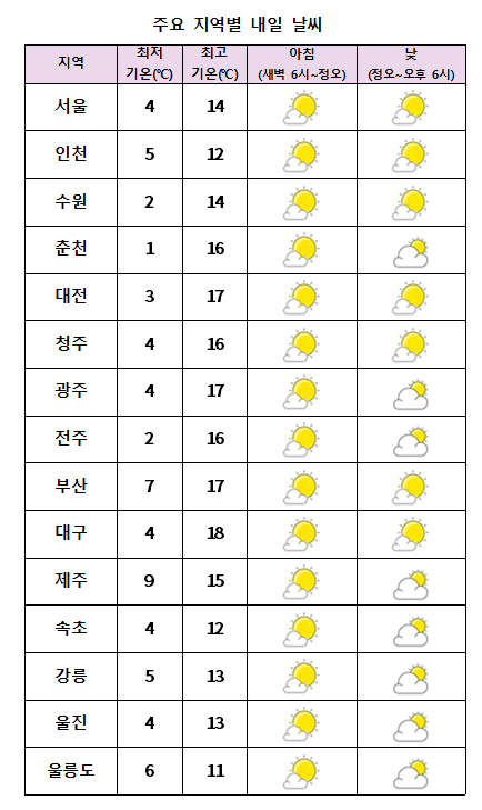¸ñ¿äÀÏÀÎ ³»ÀÏ(9ÀÏ)Àº Àü±¹ÀÌ ´ëü·Î ¸¼°ÚÀ¸³ª ¿µµ¿µ¿ÇؾÈÀº Àú³áºÎÅÍ ºñ°¡ ³»¸®°Ú´Ù. ¹Î°£±â»ó±â¾÷ ÄÉÀÌ¿þ´õ´Â ¡°³»ÀÏ ¿ì¸®³ª¶ó´Â Áß±¹ »óÇØºÎ±Ù¿¡¼ ³²µ¿ÁøÇÏ´Â °í±â¾ÐÀÇ °¡ÀåÀÚ¸®¿¡ µé°Ú´Ù¡±¸ç ¡°Àü±¹ ´ëºÎºÐ Áö¿ªÀÌ ´ëü·Î ¸¼°ÚÀ¸³ª, °¿ø¿µ¼, Àü¶óµµ, Á¦ÁÖµµ´Â ¿ÀÈÄ ÇѶ§ ±¸¸§ ¸¹¾ÆÁö°Ú´Ù¡±°í ¿¹º¸Çß´Ù. ÀÌ¾î ¡°°¿ø¿µµ¿°ú °æºÏ µ¿ÇؾÈÀº ´ëü·Î ¸¼´Ù°¡ ³·ºÎÅÍ Á¡Â÷ ±¸¸§ ¸¹¾ÆÁ® Àú³áºÎÅÍ ºñ°¡ ³»¸®°Ú°í, °¿ø»ê°£Áö¹æ¿¡´Â ¹ã¿¡ ºñ¿Í ´«ÀÌ ¼¯¿© ³»¸®´Â °÷ÀÌ ÀÖ°Ú´Ù. ¾ÆÄ§ ÃÖÀú±â¿ÂÀº 1¡É¿¡¼ 9¡É, ³· ÃÖ°í±â¿ÂÀº 11¡É¿¡¼ 18¡É°¡ ¿¹»óµÈ´Ù. ´ëºÎºÐ Áö¿ª¿¡¼ ³·°ú ¹ãÀÇ ±â¿ÂÂ÷°¡ Å©°Ù°í, ÀϺΠ³»·ú¿¡¼´Â ¾ÆÄ§ ±â¿ÂÀÌ ¿µÇÏ·Î ¶³¾îÁö´Â °÷ÀÌ ÀÖ°ÚÀ¸´Ï ³óÀÛ¹° ³ÃÇØ ÇÇÇØ¿¡ À¯ÀÇÇØ¾ß°Ú´Ù. - ¹Ì¼¼¸ÕÁö ³óµµ´Â Àü±¹ÀÇ ´ë±â ¼øÈ¯ÀÌ ¿øÈ°ÇØ ¡®º¸Å롯 ¼öÁØÀ» º¸À̰ڴÙ. ¼öµµ±Ç Áö¿ª¿¡ °ÇÁ¶ Ưº¸°¡ ¹ßÈ¿µÇ´Â µî ´ë±â°¡ ¸Å¿ì °ÇÁ¶Çϰڰí, ¿ÀÈÄ¿¡´Â ¹Ù¶÷ÀÌ ´Ù¼Ò °ÇÏ°Ô ºÒ°ÚÀ¸´Ï °¢Á¾ ÈÀç ¿¹¹æ¿¡ ÁÖÀǸ¦ ±â¿ï¿©¾ß°Ú´Ù. ¹Ù´ÙÀÇ ¹°°áÀº ¼ÇØ¿Í ³²Çػ󿡼 0.5~1.5m, µ¿Çػ󿡼 0.5~2.5m·Î ÀϰڴÙ. ÇÑÆí À̹ø ÁÖ´Â ±â¾Ð°ñÀÇ ¿µÇâÀ¸·Î 11Àϰú 13ÀÏ ³²ÇؾȰú µ¿ÇؾÈ, Á¦ÁÖµµ¿¡ ºñ°¡ ³»¸®°Ú°í, Á¦ÁÖµµ´Â 12ÀÏ¿¡µµ ºñ°¡ À̾îÁö°Ú´Ù. µ¿Ç³ÀÇ ¿µÇâÀ¸·Î 10ÀÏ °æºÏ µ¿Çؾȿ¡ ºñ°¡ ³»¸®°Ú°í, 12ÀÏÀº °¿ø¿µµ¿¿¡ ºñ°¡ ¿À°Ú´Ù.