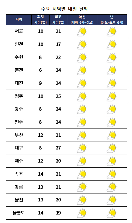 ¼ö¿äÀÏÀÎ ³»ÀÏ(29ÀÏ)Àº Àü±¹ÀÌ ´ëü·Î ¸¼Àº °¡¿îµ¥ ´ë±â°¡ ¸Å¿ì °ÇÁ¶ÇÏ°Ú°í ´ëºÎºÐ Áö¿ª¿¡¼ ³· ±â¿ÂÀÌ 20¡É¸¦ ³Ñ°Ú´Ù.
