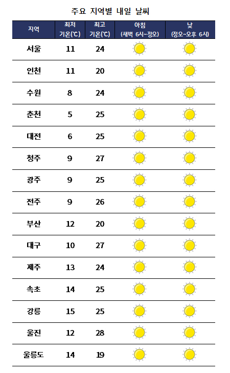 ¿¬ÈÞ Ã¹³¯ÀÎ ³»ÀÏ(30ÀÏ¡¤¸ñ)Àº Àü±¹ÀÌ ´ëü·Î ¸¼Àº °¡¿îµ¥ Çѳ·¿¡ ±â¿ÂÀÌ 25¡É ÀÌ»ó ¿À¸£´Â °÷ÀÌ ¸¹°Ú´Ù. ¹Î°£±â»ó±â¾÷ ÄÉÀÌ¿þ´õ´Â "³»ÀÏ ¸ñ¿äÀÏÀº ÀϺ» ³²ÂÊ ÇØ»ó¿¡ À§Ä¡ÇÑ °í±â¾ÐÀÇ °¡ÀåÀÚ¸®¿¡ µé¾î Àü±¹ÀÌ ´ëü·Î ¸¼°Ú´Ù"°í ¿¹º¸Çß´Ù. ¾ÆÄ§ ÃÖÀú±â¿Â 5~15¡É, ³· ÃÖ°í±â¿Â 19~28¡É·Î ³·°ú ¹ãÀÇ ±â¿ÂÂ÷°¡ 10~15¡É °¡·® Å©°Ô ¹ú¾îÁö°Ú´Ù.
