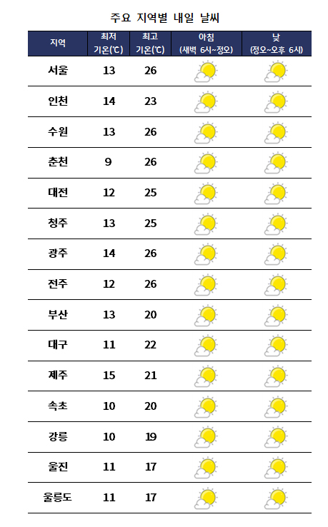 ¸ñ¿äÀÏÀÎ ³»ÀÏ(7ÀÏ)Àº Àü±¹ÀÌ ´ëü·Î ¸¼Àº °¡¿îµ¥ ³· µ¿¾È ¹«´õ¿î ÃÊ¿©¸§ ³¯¾¾±î À̾îÁö°Ú´Ù. ¹Î°£±â»ó±â¾÷ ÄÉÀÌ¿þ´õ´Â ¡°³»ÀÏ(7ÀÏ) ¿ì¸®³ª¶ó´Â µ¿ÇØ»ó¿¡ À§Ä¡ÇÑ °í±â¾ÐÀÇ ¿µÇâÀ» ¹Þ´Ù°¡ Â÷Â÷ ±× °¡ÀåÀÚ¸®¿¡ µé°Ú´Ù¡±¸ç ¡°Àü±¹ÀÌ ´ëü·Î ¸¼°Ú´Ù¡±°í ¿¹º¸Çß´Ù. ¾ÆÄ§ ÃÖÀú±â¿ÂÀº 9¡É¿¡¼ 15¡É, ³· ÃÖ°í±â¿ÂÀº 17¡É¿¡¼ 26¡É°¡ µÇ°Ú´Ù.