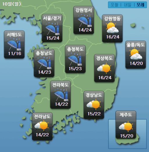 ¹Î°£±â»ó±â¾÷ ÄÉÀÌ¿þ´õ´Â "Åä¿äÀÏ(9ÀÏ)Àº ÁߺÎÁö¹æÀ» Áö³ª´Â Àú±â¾ÐÀÇ ¿µÇâÀ» ¹Þ¾Æ Àü±¹ÀÌ È帰 °¡¿îµ¥ ºñ°¡ ³»¸®°Ú´Ù"¸ç "¼ÂÊÁö¹æÀº ³·±îÁö ºñ°¡ ¿À°Ú°í, µ¿ÂÊÁö¹æÀº ¹ã±îÁö ºñ¿Â ÈÄ È帮°Ú´Ù"°í ¿¹º¸Çß´Ù.