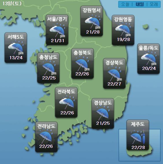 ¹Î°£±â»ó±â¾÷ ÄÉÀÌ¿þ´õ´Â "Åä¿äÀÏ(13ÀÏ)Àº ³²¼ÂÊ¿¡¼ ºÏµ¿ÁøÇÏ´Â Àú±â¾ÐÀÇ ¿µÇâÀ» ¹Þ°Ú´Ù. Á¦ÁÖµµ ¹× Àü¶ó³²µµ¿¡ ³»¸®´Â ºñ´Â »õº®¿¡ °æ»ó³²µµ±îÁö È®´ëµÇ°Ú´Ù. ÀÌÈÄ ¾ÆÄ§¿¡ Àü¶óºÏµµ, ³·¿¡´Â ÃæÃ»µµ ¹× °æ»óºÏµµ, ¿ÀÈÄ¿¡´Â ÁߺϺÎÁö¹æ¿¡ ºñ°¡ ¿À°Ú´Ù"°í ¿¹º¸Çß´Ù.