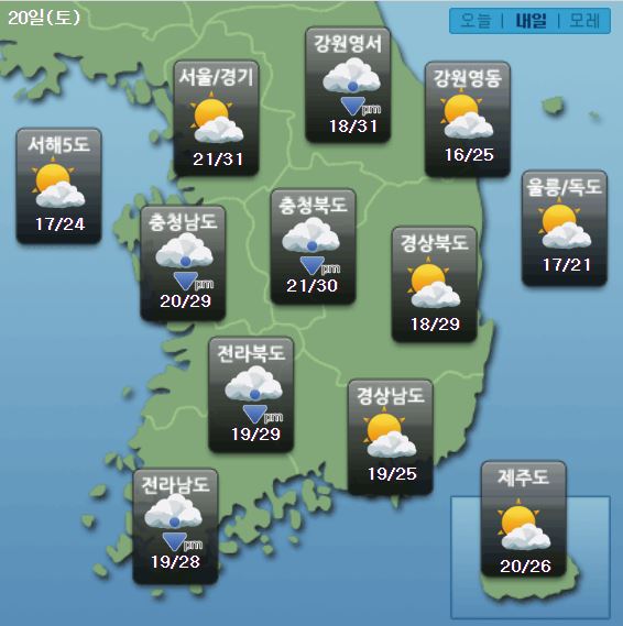 ÀÏ¿äÀÏÀº ¼ÇØ»ó¿¡ À§Ä¡ÇÑ °í±â¾ÐÀÇ ¿µÇâÀ» ¹Þ°Ú´Ù. Àü±¹ÀÌ ´ëü·Î ¸¼°ÚÀ¸³ª, µ¿ºÎ³»·ú¿¡´Â ´ë±â ºÒ¾ÈÁ¤À¸·Î ¿ÀÈÄ ÇѶ§ ¼Ò³ª±â°¡ ¿À´Â °÷ÀÌ ÀÖ°Ú´Ù. ÁÖ¸» µ¿¾È ¾ÆÄ§ ÃÖÀú±â¿ÂÀº 16¡É¿¡¼ 21¡É, ³· ÃÖ°í±â¿ÂÀº 23¡É¿¡¼ 32¡É°¡ µÇ°Ú´Ù. ³»·úÀ» Áß½ÉÀ¸·Î ³· ±â¿ÂÀÌ 30¡É ÀÌ»ó ¿À¸£´Â °÷ÀÌ ÀÖ°ÚÀ¸³ª, °¿øµ¿ÇؾÈÀº µ¿Ç³ÀÌ À¯ÀÔµÇ¸é¼ ³· ±â¿ÂÀÌ 25¡É ³»¿Ü·Î ¼±¼±ÇϰڴÙ. ¹Ì¼¼¸ÕÁö ³óµµ´Â Àü±¹ÀÌ ¡®º¸Å롯 ´Ü°è¸¦ º¸À̰ÚÀ¸³ª Àڿܼ± Áö¼ö´Â ¡®¸Å¿ì ³ª»Ý¡¯ ´Ü°è±îÁö ¿À¸£°Ú´Ù.
