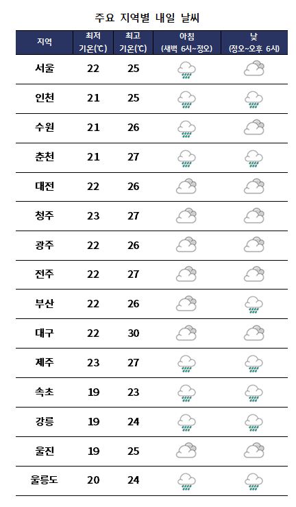 ¸ñ¿äÀÏÀÎ ³»ÀÏ(25ÀÏ)Àº È帰 °¡¿îµ¥ Àü±¹ ´ëºÎºÐ Áö¿ª¿¡ Àå¸Àºñ°¡ ³»¸± Àü¸ÁÀÌ´Ù. ¹Î°£±â»ó±â¾÷ ÄÉÀÌ¿þ´õ´Â ¡°³»ÀÏ(25ÀÏ)Àº Áß±¹ »êµÕ¹Ýµµ ºÎ±Ù¿¡¼ ºÏµ¿ÁøÇØ ÁߺÎÁö¹æÀ» Áö³ª´Â Àú±â¾Ð°ú ÇÔ²² ºÏ»óÇÏ´Â Á¤Ã¼Àü¼±ÀÇ ¿µÇâÀ» ¹Þ°Ú´Ù¡±¸ç ¡°Àü¶óµµ¸¦ Á¦¿ÜÇÑ Àü±¹ÀÌ ºñ°¡ ¿Â ÈÄ °³°Ú°í, Àü¶óµµ´Â È帰 ÈÄ °³°Ú´Ù¡±°í ¿¹º¸Çß´Ù. ÀÌ¾î ¡°ÁߺÎÁö¿ª°ú Á¦ÁÖµµ´Â Àú³á±îÁö ºñ°¡ ¿Â ÈÄ °³°Ú°í, ±× ¹ÛÀÇ Áö¿ªÀº ¾ÆÄ§¿¡¼ ³· »çÀÌ ºñ°¡ ±×Ä¡°Ú´Ù¡±°í ÀüÇß´Ù. * ¿¹»ó °¼ö·®(~25ÀÏ) - °æ±âºÏºÎ, °¿øµµ, Á¦ÁÖµµ, ³²ÇØ¾È : 30~80mm (¸¹Àº °÷ 120mm ÀÌ»ó) - ±× ¹ÛÀÇ Àü±¹ : 10~30mm ¾ÆÄ§ ÃÖÀú±â¿ÂÀº 19¡É¿¡¼ 23¡É, ³· ÃÖ°í±â¿ÂÀº 23¡É¿¡¼ 30¡É°¡ µÇ°Ú´Ù. ÁߺÎÁö¹æÀº ¹ã±îÁö ºñ°¡ À̾îÁö¸é¼ ±â¿ÂÀÌ ¿À´Ã(22~26¡É)°ú ºñ½ÁÇØ ¼±¼±ÇϰÚÀ¸³ª ³²ºÎÁö¹æÀº ´Ù¼Ò ³ô°Ú°í, °æºÏ³»·úÀº 30¡É ¾ÈÆÆ±îÁö ¿À¸£°Ú´Ù.