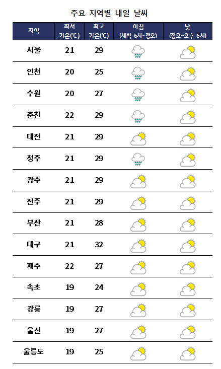 ±Ý¿äÀÏÀÎ ³»ÀÏ(26ÀÏ)Àº Àü±¹ÀÌ ´ëü·Î ±¸¸§ÀÌ ¸¹Àº ³¯¾¾¸¦ º¸À̰ڰí, ³²ºÎÁö¹æÀº Àڿܼ±ÀÌ ´Ù¼Ò °ÇÒ Àü¸ÁÀÌ´Ù.