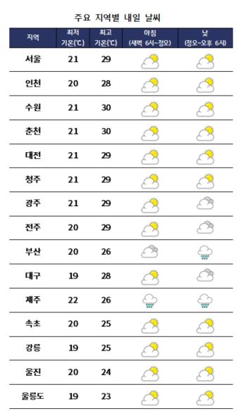 ±Ý¿äÀÏÀÎ ³»ÀÏ(3ÀÏ)Àº Àü±¹ÀÌ È帰 °¡¿îµ¥ ³²ÇؾȰú Á¦ÁÖµµ¿¡ ºñ°¡ ¿À°Ú´Ù. ¹Î°£±â»ó±â¾÷ ÄÉÀÌ¿þ´õ´Â ¡°³»ÀÏ(3ÀÏ) ¿ì¸®³ª¶ó´Â µ¿ÇØ»ó¿¡ À§Ä¡ÇÑ °í±â¾ÐÀÇ ¿µÇâÀ» ¹Þ°Ú°í, ³²ÇØ¾È ¹× Á¦ÁÖµµ´Â ÀϽÃÀûÀ¸·Î ºÏ»óÇÏ´Â À帶Àü¼±ÀÇ ¿µÇâÀ» ¹Þ´Ù°¡ ¹þ¾î³ª°Ú´Ù¡±°í ¿¹º¸Çß´Ù. Àü±¹ÀÌ ´ëü·Î È帮´Ù°¡ Á¡Â÷ °³°Ú°í, Á¦ÁÖµµ´Â È帮°í »õº®ºÎÅÍ ºñ°¡ ¿À°Ú´Ù. ³²ÇؾÈÀº ³·¿¡ ºñ°¡ È®´ëµÅ ¹ã¿¡ ´ëºÎºÐ ±×Ä¡°Ú´Ù. * ¿¹»ó°¼ö·®(3ÀÏ) - Á¦ÁÖµµ : 20~50mm - ³²ÇØ¾È : 5~20mm ³»·úÁö¹æÀ» Áß½ÉÀ¸·Î ³· ±â¿ÂÀÌ 30¡É ¾ÈÆÆ±îÁö ¿À¸£¸ç ¹«´þ°Ú´Ù. ¾ÆÄ§ ÃÖÀú±â¿ÂÀº 19¡É¿¡¼ 22¡É, ³· ÃÖ°í±â¿ÂÀº 23¡É¿¡¼ 30¡É°¡ µÇ°Ú´Ù.